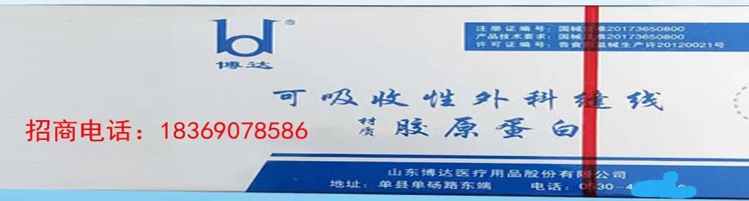 山东博达医疗用品股份有限公司是生产可吸收性外科缝线专业厂家,主要产品有可吸收缝合线、内窥镜圈套线、穴位埋线、快吸收美容线、医用羊肠线胶原蛋白线以独特的生物技术提取了健康哺乳动物内脏的胶原蛋白为基材,采用先进独特的工艺加工而成,线体的主要成分为高纯度胶原蛋白,并获得了国家发明专利,颁布了YZB/国6301-2013《可吸收性外科缝线》产品标准,并通过了ISO9001:2008和ISO13485:2003质量管理体系认证。