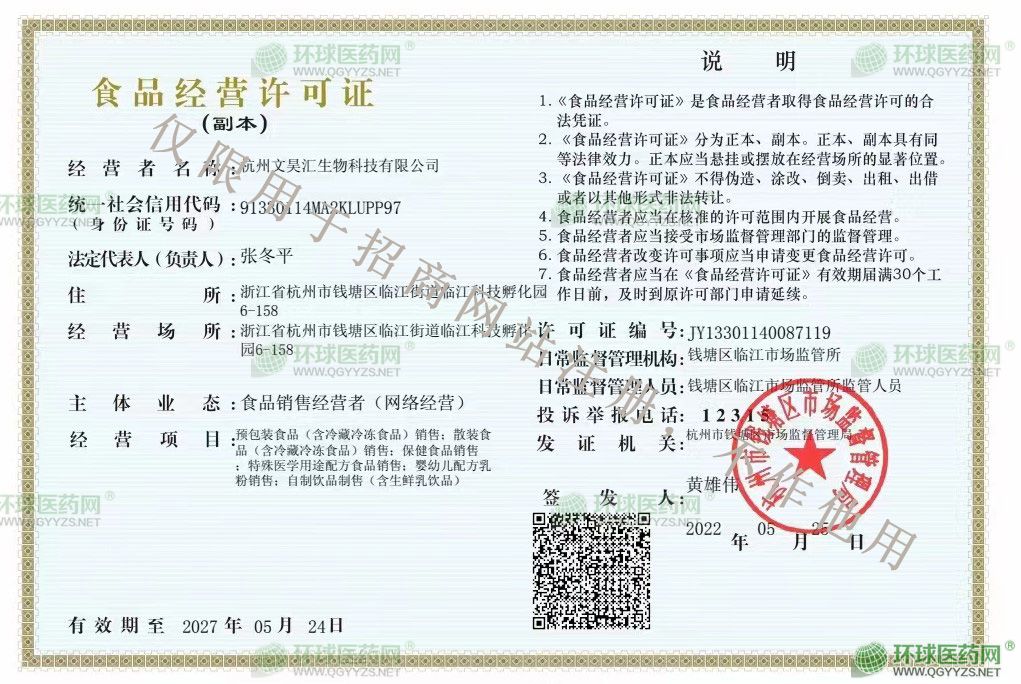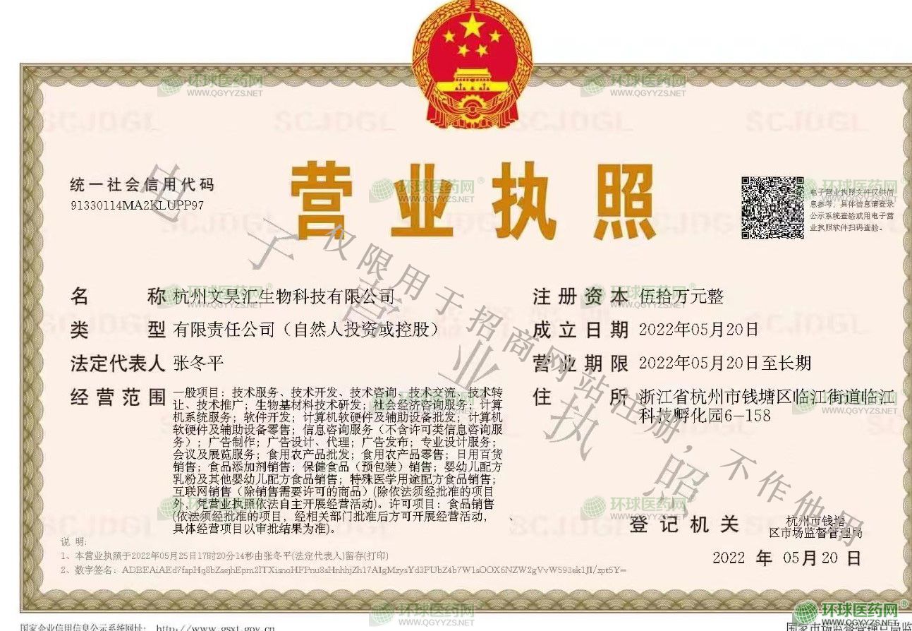 杭州文昊汇生物科技有限公司成立于2022年05月20日,注册地位于浙江省杭州市钱塘区临江街道临江科技孵化园6-158,法定代表人为张冬平。经营范围包括一般项目:技术服务、技术开发、技术咨询、技术交流、技术转让、技术推广;生物基材料技术研发;社会经济咨询服务;计算机系统服务;软件开发;计算机软硬件及辅助设备批发;计算机软硬件及辅助设备零售;信息咨询服务(不含许可类信息咨询服务);广告制作;广告设计、代理;广告发布;专业设计服务;会议及展览服务;食用农产品批发;食用农产品零售;日用百货销售;食品添加剂销售;保健食品(预包装)销售;婴幼儿配方乳粉及其他婴幼儿配方食品销售;特殊医学用途配方食品销售;互联网销售(除销售需要许可的商品)(除依法须经批准的项目外,凭营业执照依法自主开展经营活动)。许可项目:食品销售(依法须经批准的项目,经相关部门批准后方可开展经营活动,具体经营项目以审批结果为准)。