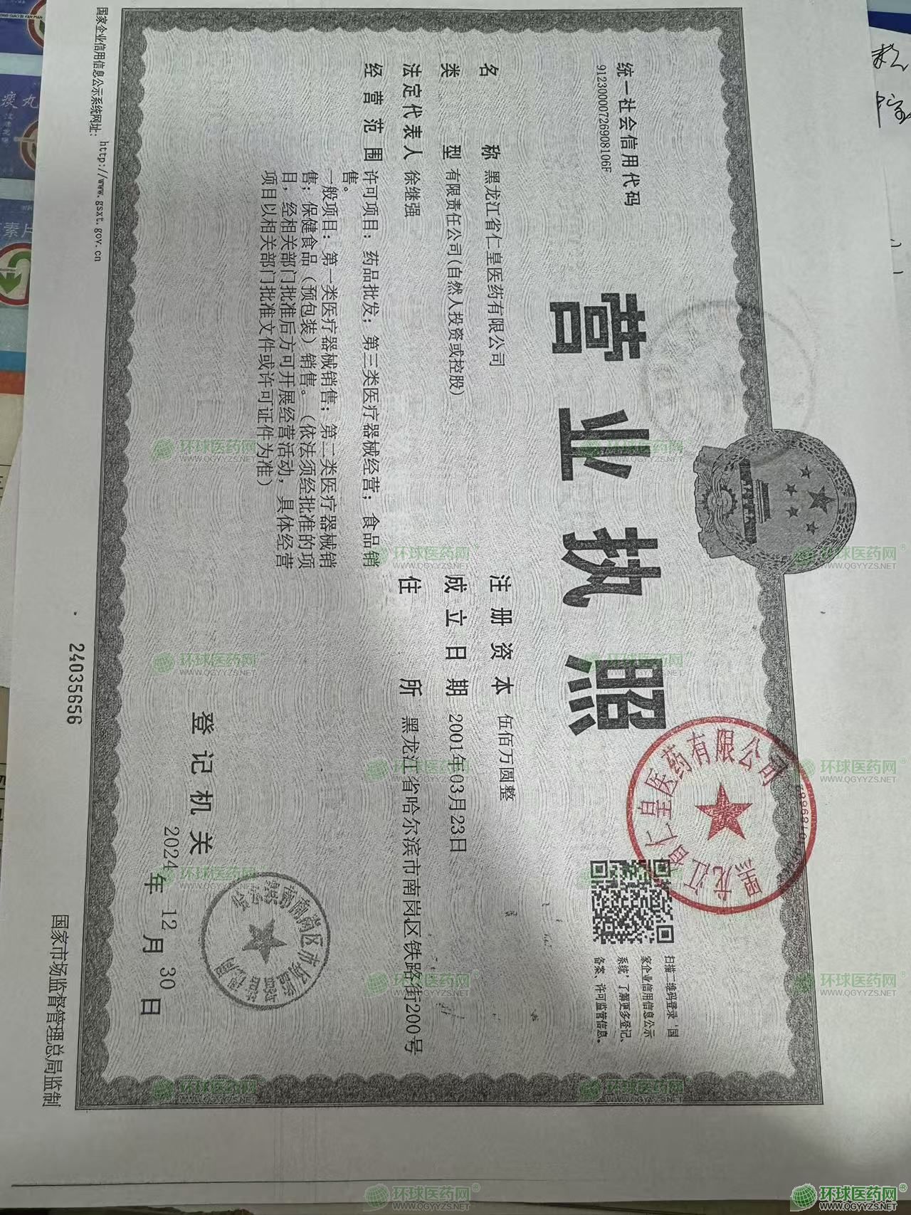 黑龙江省仁皇医药有限公司于2001年3月创立。位于哈尔滨市南岗区铁路街200号,注册资本500万元人民币。营业面4000余平方米,其中贮存面积3000多平方米。