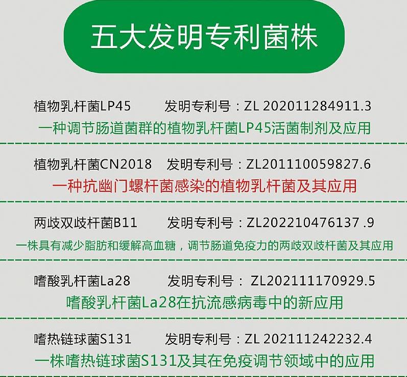 ②专利菌种,添加五大发明专利菌株,尤其是可抗幽门螺旋杆菌专利菌株。专利号:Zl 201110059827.6,一种抗幽门螺杆菌感染的植物乳杆菌及其应用。