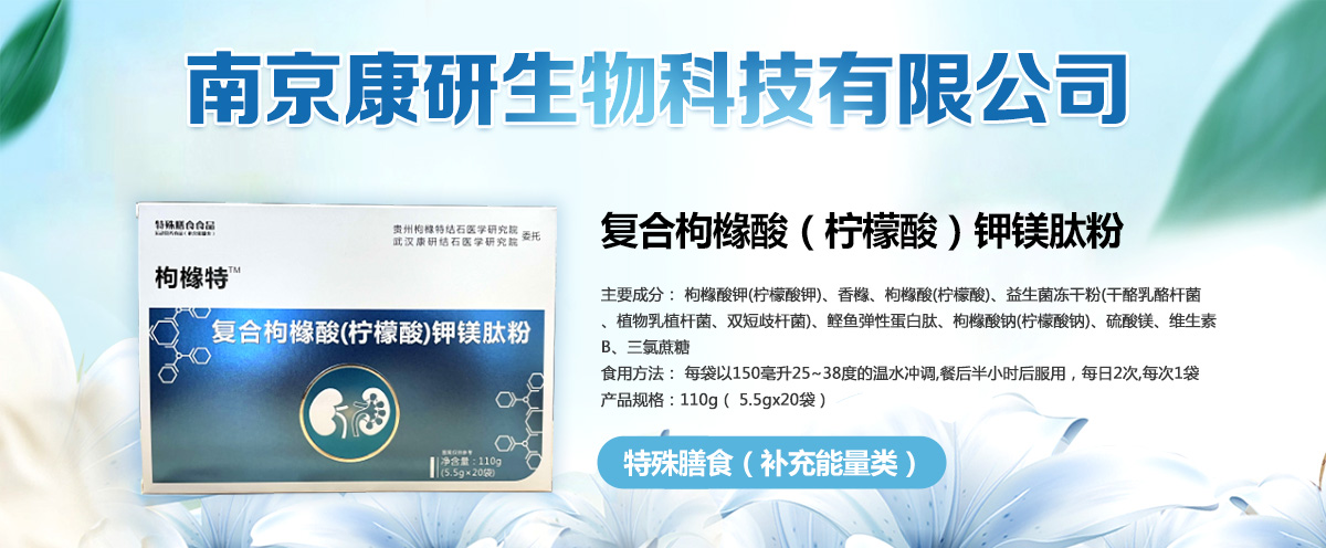 复合枸缘酸(柠檬酸)钾镁肽粉,特膳食品,全国控销,适合结石手术前后服用,禁挂网! 01产品来源 南京康研生物科技有限公司是一家专注于泌尿系结石研究、从事医学特殊膳食研发及医疗器械研发的企业。南京康研总部位于南京。于贵州设立贵州构橼特结石医学研究院,在武汉设立武汉康研结石医学研究院,聘请多位医学专员对泌尿系结石领域进行临床
