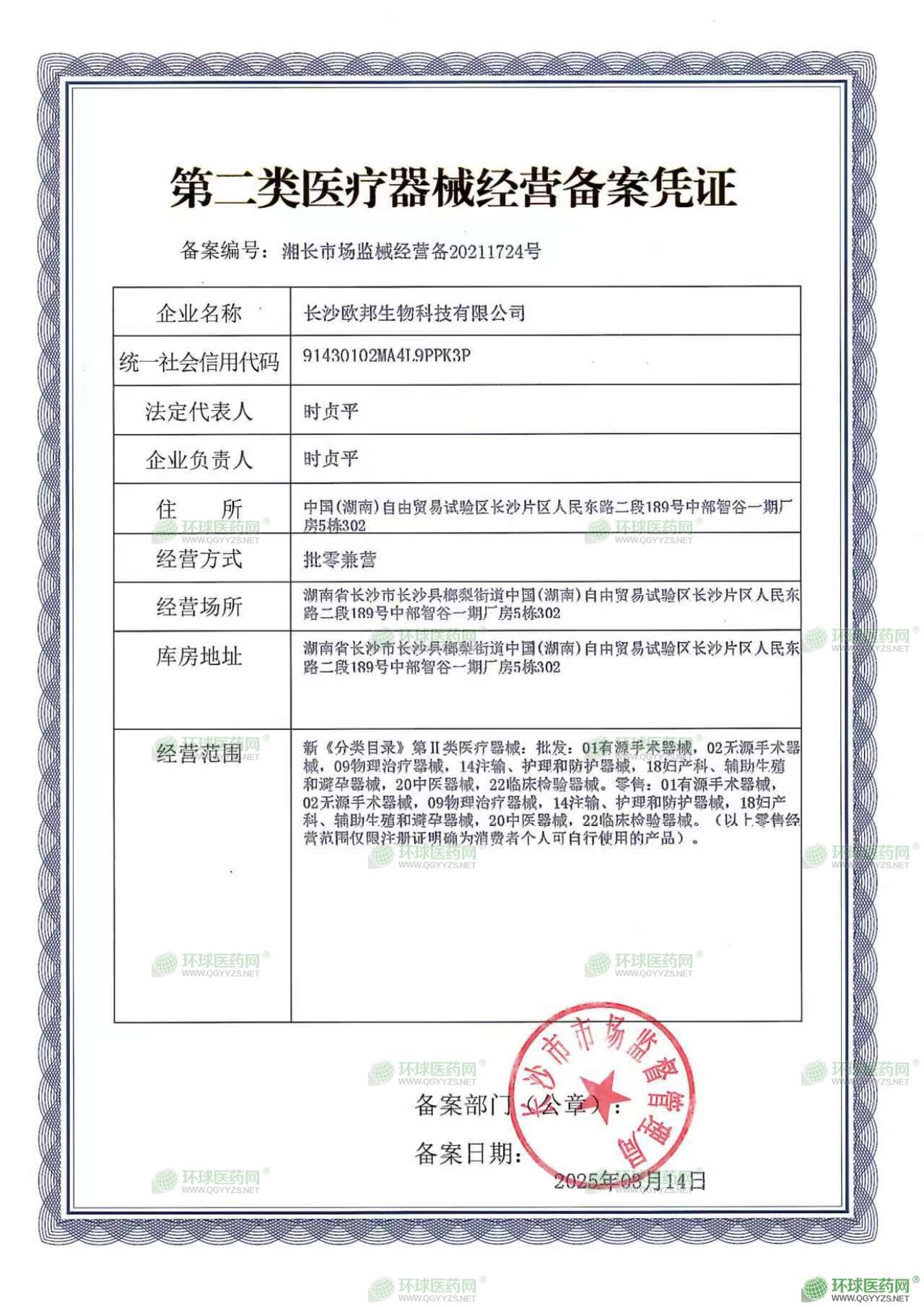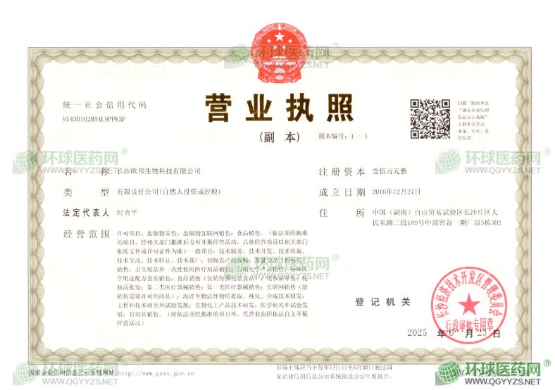 长沙欧邦生物科技有限公司于2024年11月16日被认定为国家高新技术企业,证书编号GR202443005034,发证日期为2025年3月5日。