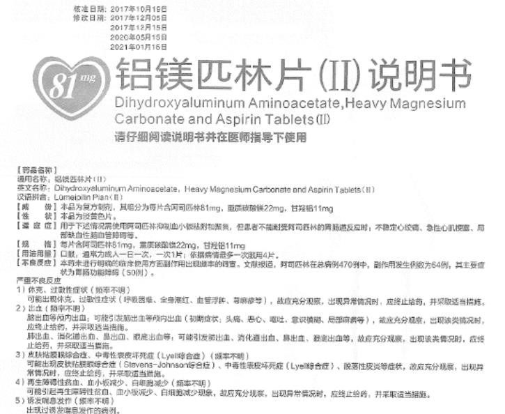 【规格】每片含阿司匹林81mg,重质碳酸镁22mg,甘羟铝11mg