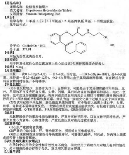 - 本页面信息仅供参考,请以产品实际附带说明书为准。 华南牌 盐酸普罗帕酮片 说明书文字版 【产品名称】:盐酸普罗帕酮片 【