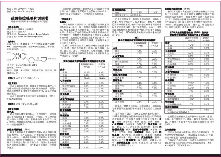 - 本页面信息仅供参考,请以产品实际附带说明书为准。 高特灵 盐酸特拉唑嗪片 说明书文字版 见以下图片版 高特灵 盐酸特拉唑嗪片