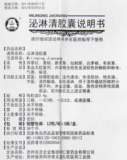 中成药、非OTC、医保乙类。"苗医:旭嘎帜沓痂,洼内通诘;休洼凯纳,殃矢迪。中医:清热解毒,利尿通淋。用于湿热蕴结所致的小便不利,淋漓涩痛,尿血,急性非特异性尿路感染,前列腺炎见上述证候者。由贵州百灵企业集团和仁堂药业有限公司生产,国药准字Z20026567。目前在环球医药网招商。【药品名称】通用名称:泌淋清胶囊
