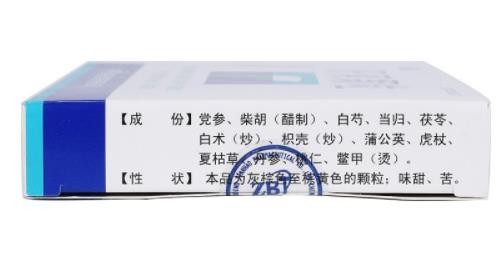 柴胡(醋制)、白芍、当归、茯苓、白术(炒)、党参、鳖甲(烫)、蒲公英、虎杖、夏枯草、丹参、桃仁等13味。