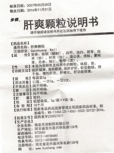 - 本页面信息仅供参考,请以产品实际附带说明书为准。 步长肝爽颗粒 外包装 步长肝爽颗粒保定天浩制药说明书(2016版)