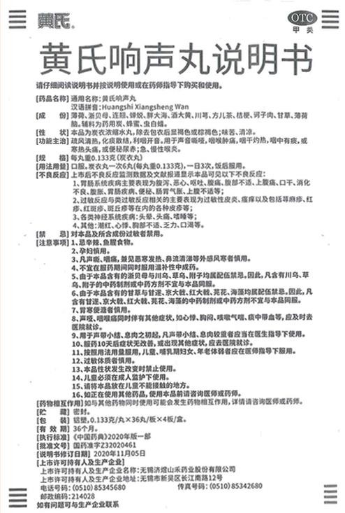 - 本页面信息仅供参考,请以产品实际附带说明书为准。 济民可信黄氏响声丸 外包装 济民可信黄氏响声丸 说明书图片版