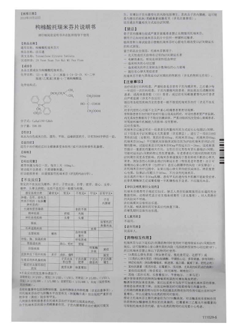 【成份】枸橼酸托瑞米芬 化学名称为:(Z)-2-[4-(4-Chloro-1,2-diphenyl-1-butenyl)phenoxy]-N,N-dimethylethanamine分子式:C26H28ClNO分子量:405.97