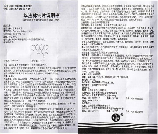 - 本页面信息仅供参考,请以产品实际附带说明书为准。 上海信谊 华法林钠片 说明书文字版 【商品名】华法林钠片 【中文通用名】