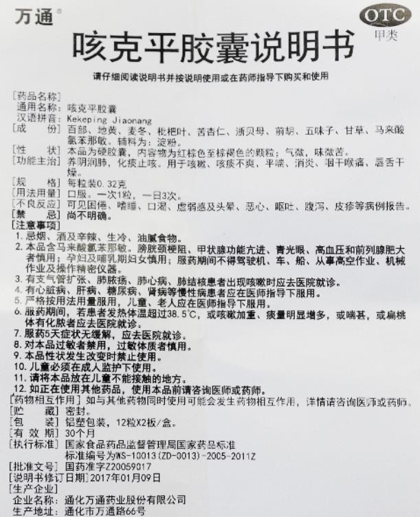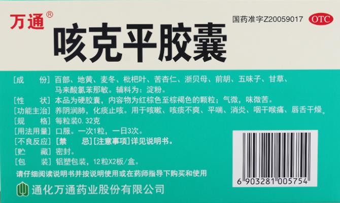 - 本页面信息仅供参考,请以产品实际附带说明书为准。 万通牌咳克平胶囊 外包装 万通牌咳克平胶囊 说明书