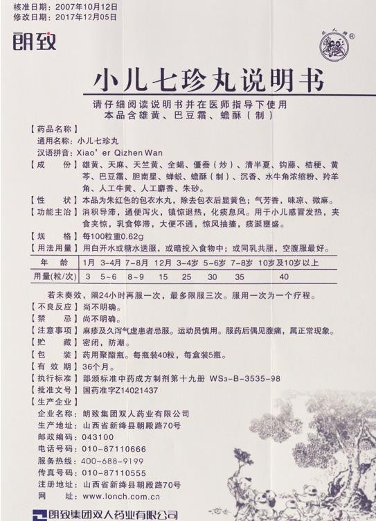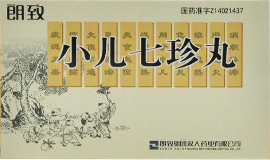 - 本页面信息仅供参考,请以产品实际附带说明书为准。 朗致双人牌小儿七珍丸包装 朗致双人牌小儿七珍丸使用说明书 【药品