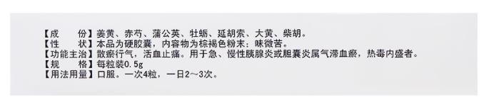 【功能主治】散於行气、活血止痛、用于急、慢性胰腺炎或胆囊炎属气滞血瘀,热毒内盛者。