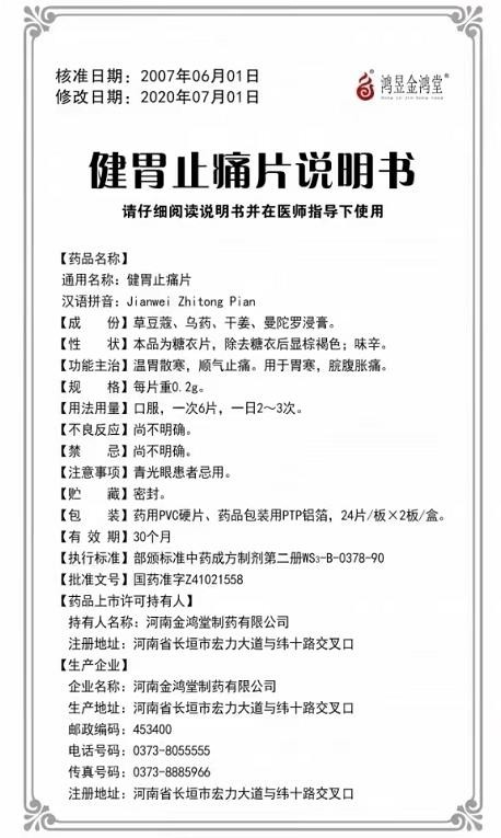 - 本页面信息仅供参考,请以产品实际附带说明书为准。 金鸿堂 健胃止痛片 说明书文字版 【药品名称】通用名称:健胃止痛片 【成份】