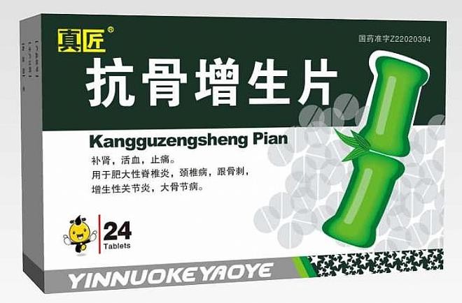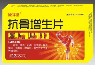 中成药、处方药、医保乙类。补肾,活血,止痛。用于肥大性脊椎炎,颈椎病,跟骨刺,增生性关节炎,大骨节病。招商厂家:河南省顺康医药有限责任公司、吉林省金泓医药有限公司、陕西为一生药业有限公司、吉林省岳氏天博医药有限公司、盛瑞药业集团等。【药品名称】通用名称:抗骨增生片