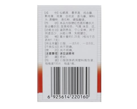 - 本页面信息仅供参考,请以产品实际附带说明书为准。 养血安神片,中成药名。由仙鹤草、墨旱莲、鸡血藤、熟地黄、地黄、合欢皮、首乌藤组