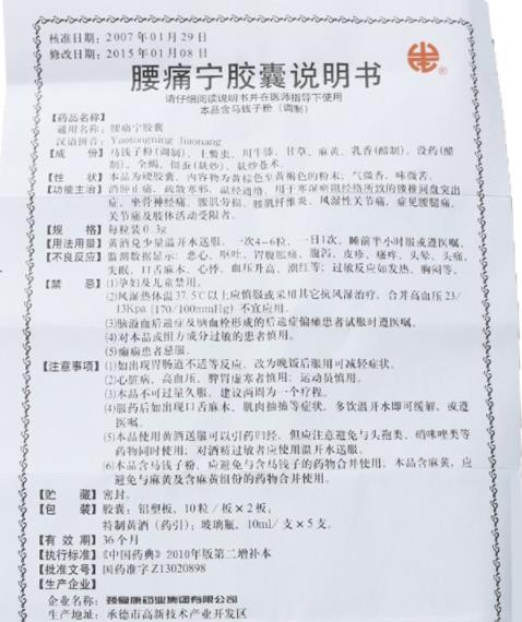 【不良反应】腰痛宁胶囊在治疗过程中,个别患者用药头几天可能出现皮肤药疹,一般不须停药,一周后自行消退,无须治疗。少数腰椎间盘突出患者用药前几天可出现疼痛加重,继续用药即可好转。如明显加重可服一粒,待1-2周后再恢复原剂量。
