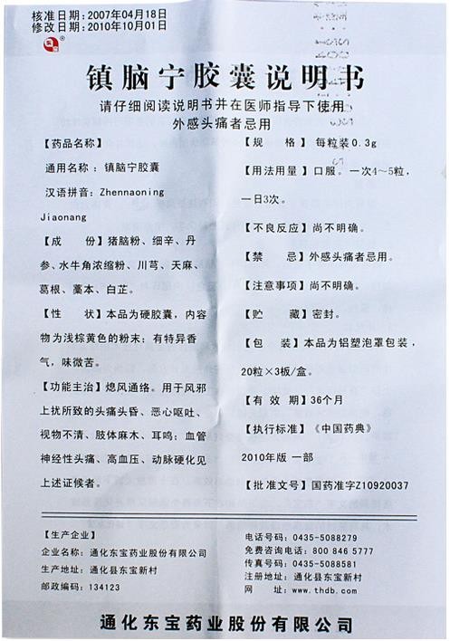 - 本页面信息仅供参考,请以产品实际附带说明书为准。 东宝镇脑宁胶囊 外包装 东宝镇脑宁胶囊 说明书(2010年版)