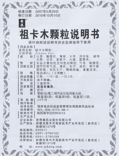 - 本页面信息仅供参考,请以产品实际附带说明书为准。 新疆奇康哈博维祖卡木颗粒 外包装 新疆奇康哈博维祖卡木颗粒说明书
