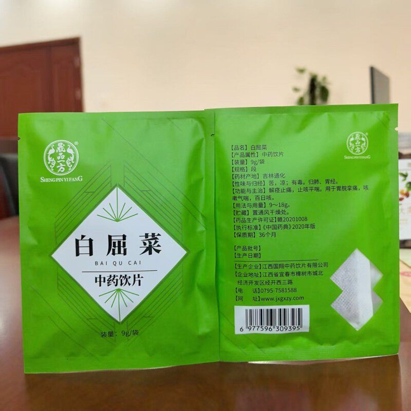 BaiqucaiCHELIDONIIHERBA本品为罂粟科植物白屈菜chelidoniummajusL的干燥全草。夏、秋二季采挖,除去泥砂,阴干或晒干。【性状】本品根呈圆锥状,多有分枝,密生须根。茎干瘪中空,表面黄绿色或绿褐色,有的可见白粉。叶互生,多皱缩、破碎,完整者为一至二回羽状分裂,裂片近对生,先端钝,边缘具不整齐的缺刻;上表面黄绿色,下表面绿灰色,具白色柔毛,脉上尤多。花瓣4片,卵圆形,黄色,雄蕊多数,雌蕊1。蒴果细圆柱形;种子多数,卵形,细小,黑色。气微,味微苦。【鉴别】(1)本品粉末绿褐色或黄褐色。纤维多成束,细长,两端平截,直径25~40μm,壁薄。导管多为网纹导管、梯纹导管及螺纹导管,直径25~45μm。叶上表皮细胞多角形;叶下表皮细胞壁波状弯曲,气孔为不定式。非腺毛由1~10余个细胞组成,表面有细密的疣状突起,顶端细胞较尖,中部常有一至数个细胞缢缩。花粉粒类球形,直径20~38μm,表面具细密的点状纹理,具3个萌发孔。果皮表皮细胞长方形或长梭形,长60~100μm,宽25~40μm,有的细胞中含草酸钙方晶,细胞壁呈连珠状增厚。淀粉粒单粒,直径3~10μm;复粒由2~10分粒组成。(2)取本品粉末1g,加盐酸一甲醇(0.5:100)混合溶液20ml,加热回流45分钟,滤过,滤液蒸干,残渣加水10ml使溶解,用石油醚(60~90℃)振摇提取2次,每次10ml,弃去石油醚液,用0.1mol/L氢氧化钠溶液调节pH值至7~8,用二氯甲烷振摇提取2次,每次20ml,合并二氯甲烷液,蒸干,残渣加甲醇1ml使溶解,作为供试品溶液。另取白屈菜对照药材1g,同法制成对照药材溶液。再取白屈菜红碱对照品,加甲醇制成每1ml含0.1mg的溶液,作为对照品溶液。照薄层色谱法(附录ⅥB)试验,吸取上述三种溶液各2μl,分别点于同一硅胶G薄层板上,以甲苯一乙酸乙酯一甲醇(10:2:0.2)为展开剂,展开,取出,晾干,置紫外光灯(365nm)下检视。供试品色谱中,在与对照药材色谱和对照品色谱相应的位置上,显相同颜色的荧光斑点。【检查】水分不得过13.0%(附录ⅨH第一法)。总灰分不得过12.0%(附录ⅨK)。【浸出物】照醇溶性浸出物测定法项下的热浸法测定,用稀乙醇作溶剂,不得少于17.0%。【含量测定】照《高效液相色谱法检验标准操作程序》测定。色谱条件与系统适用性试验以十八烷基硅烷键合硅胶为填充剂;以乙腈1%三乙胺溶液(磷酸调pH值至3.0)(26:74)为流动相;检测波长为269nm。理论板数按白屈菜红碱峰计算应不低于2000。对照品溶液的制备取白屈菜红碱对照品适量,精密称定,加甲醇制成每1m1含50tLg的溶液,即得。供试品溶液的制备取本品粉末(过三号筛)约2g,精密称定,置圆底烧瓶中,精密加盐酸_甲醇(0.5:100)混合溶液40ml,称定重量,加热回流1.5小时,放冷,再称定重量,用盐酸一甲醇(0.5:100)混合溶液补足减失的重量,摇匀,滤过,精密量取续滤液20ml,蒸干,残渣加50%甲醇使溶解,转移至10ml量瓶中,加50%甲醇至刻度,摇匀,滤过,取续滤液,即得。测定法分别精密吸取对照品溶液与供试品溶液各10μl,注入液相色谱仪,测定,即得。本品按干燥品计算,含自屈菜红碱(C21H18N4O+了)不得少于0.020%。饮片【炮制】除去杂质,喷淋清水,稍润,切段,干燥。【性味与归经】苦,凉;有毒。归肺、胃经。【功能与主治】解痉止痛,止咳平喘。用于胃脘挛痛,咳嗽气喘,百日咳。【用法与用量】9~18g。【贮藏】置通风干燥处。