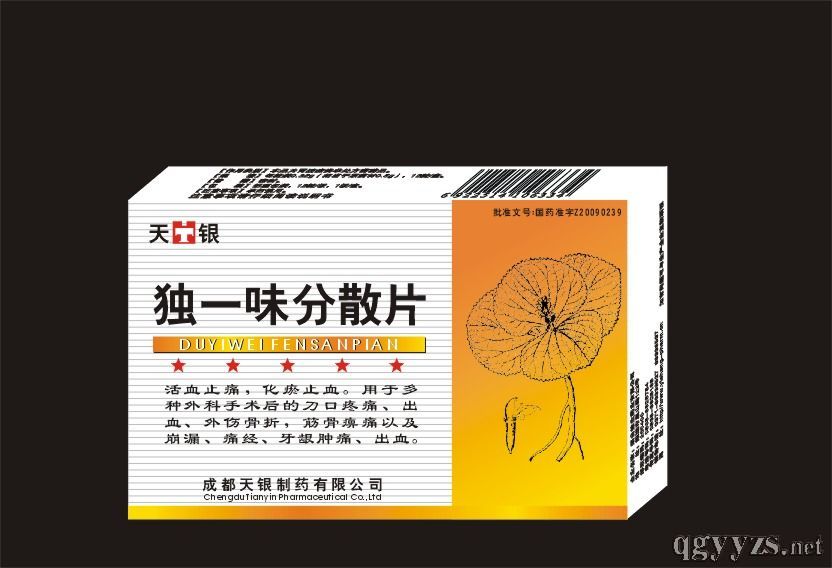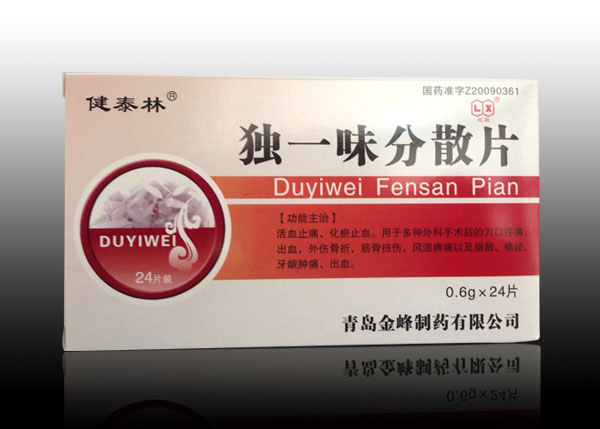 独一味分散片,中成药名。由独一味组成。具有活血止痛,化瘀止血的功效。用于多种外科手术后的刀口疼痛、出血,外伤骨折,筋骨扭伤,风湿痹痛以及崩漏,痛经,牙龈肿痛、出血。