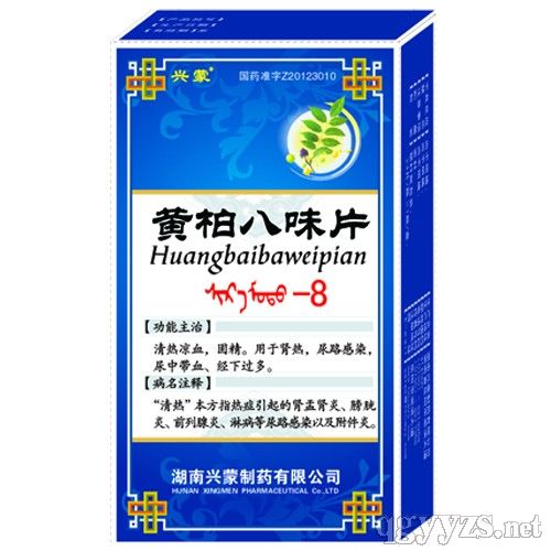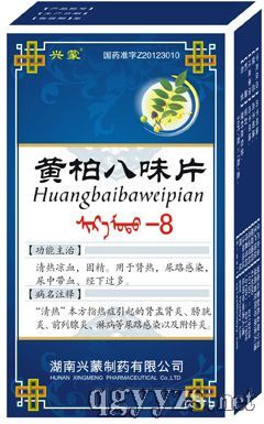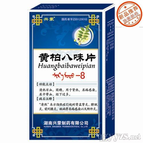 黄柏八味片,中成药名。由黄柏、香墨、栀子、甘草、红花、荜茇、牛胆粉、黑云香组成。具有清热凉血,固精的功效。用于肾热,尿路感染,尿中带血,经下过多。