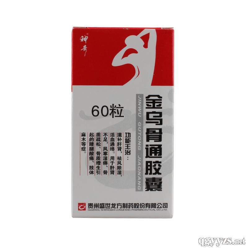 金乌骨通胶囊,苗医:维象样丢象,泱安档蒙:僵是风,稿计凋嘎豪。中医:滋补肝肾,祛风除湿,活血通络。用于肝肾不足,风寒湿痹、骨质疏松、骨质增生引起的腰腿酸痛、肢体麻木等症。成分:金毛狗脊、乌梢蛇、葛根、淫羊藿、木瓜、威灵、补骨脂。