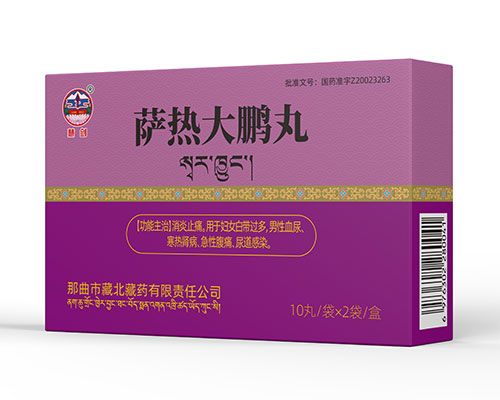 萨热大鹏丸,中成药名。由诃子、安息香、蜀葵花、朱砂、山矾叶、珍珠粉等组成。具有清热止痛的功效。用于妇女白带过多,男性血尿,寒热肾病,急性腹痛,尿道感染。