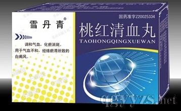 桃红清血丸,中成药名。由炒蒺藜、紫草、降香、拳参、白薇、炒桃仁、红花、制何首乌、甘草、麸炒苍术、龙胆、白药子、海螵蛸组成。具有调和气血,化瘀消斑的功效。用于气血不和,经络瘀滞所致的白癜风。