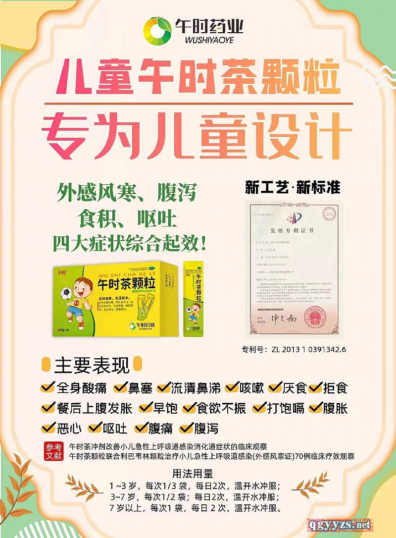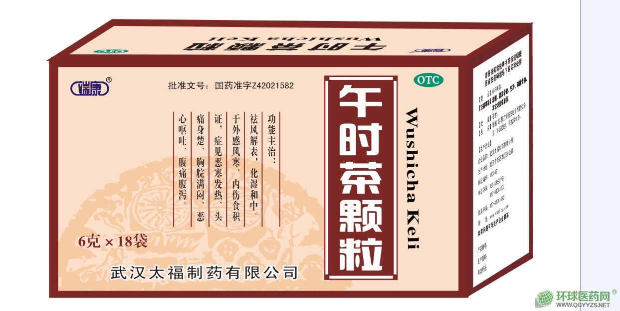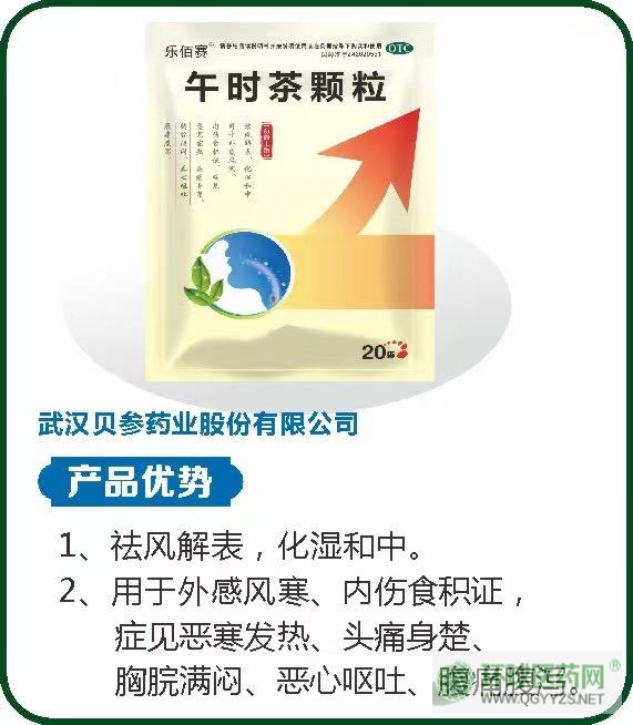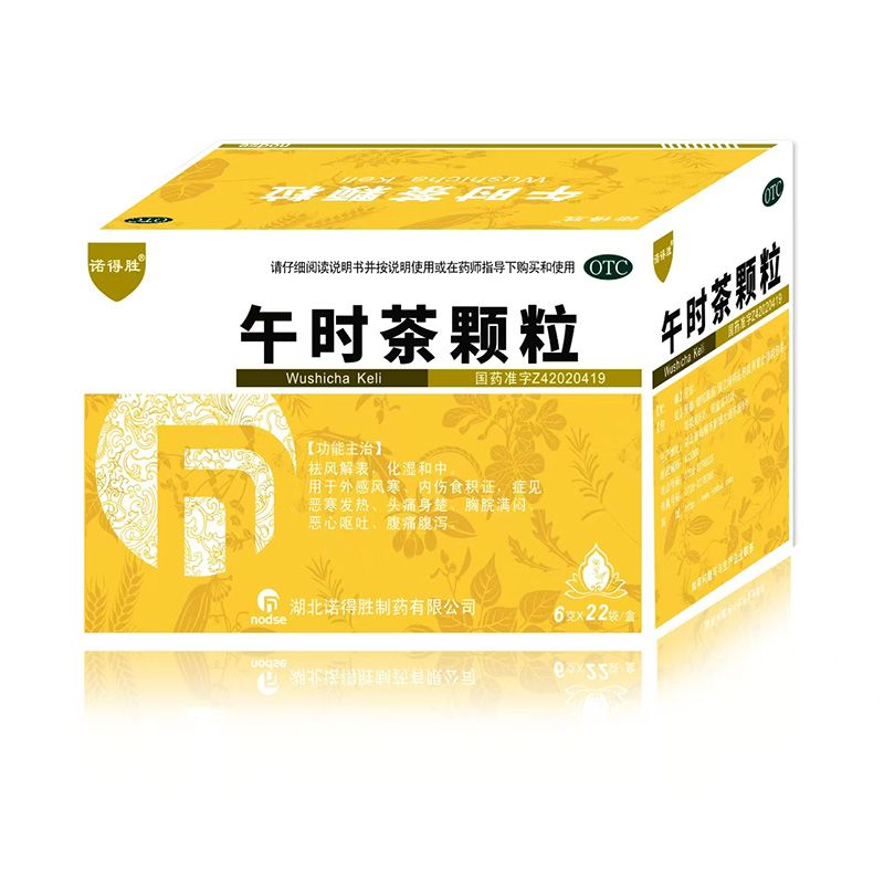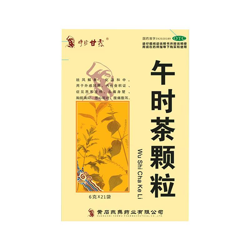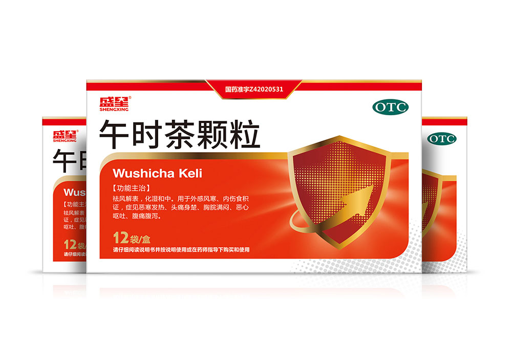 午时茶颗粒,中成药名。由苍术、柴胡、羌活、防风、白芷、川芎、广藿香、前胡、连翘、陈皮、山楂、枳实、炒麦芽、甘草、桔梗、紫苏叶、厚朴、红茶、六神曲(炒)组成。具有祛风解表,化湿和中的功效。用于外感风寒、内伤食积证,症见恶寒发热、头痛身楚、胸脘满闷、恶心呕吐、腹痛腹泻。