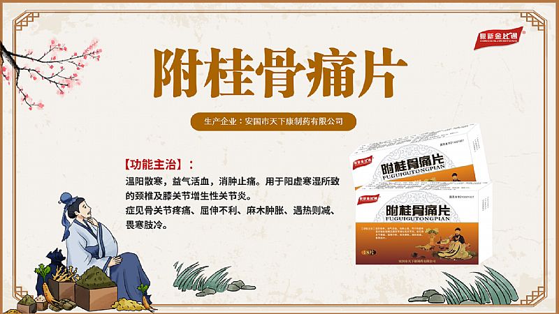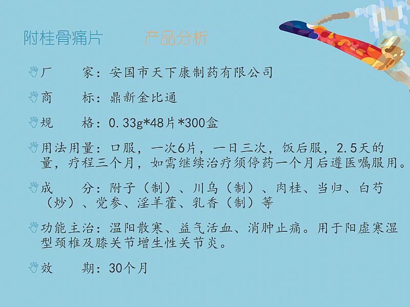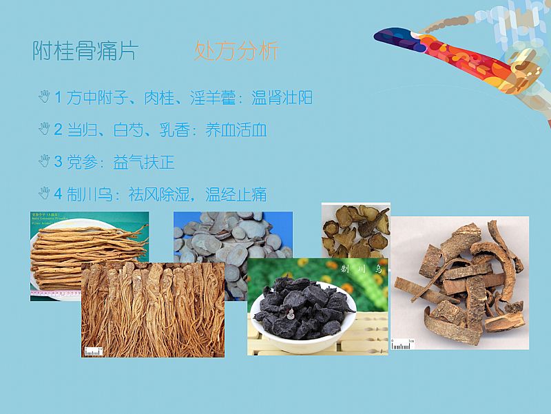 | 作用机理 | 温阳散寒,益气活血,消肿止痛。 1附子、肉桂、淫羊藿:温肾壮阳 2当归、白芍、乳香:养血活血 3党参:益气扶正 4制川乌:祛风除湿,温经止痛 |