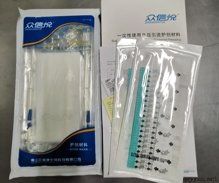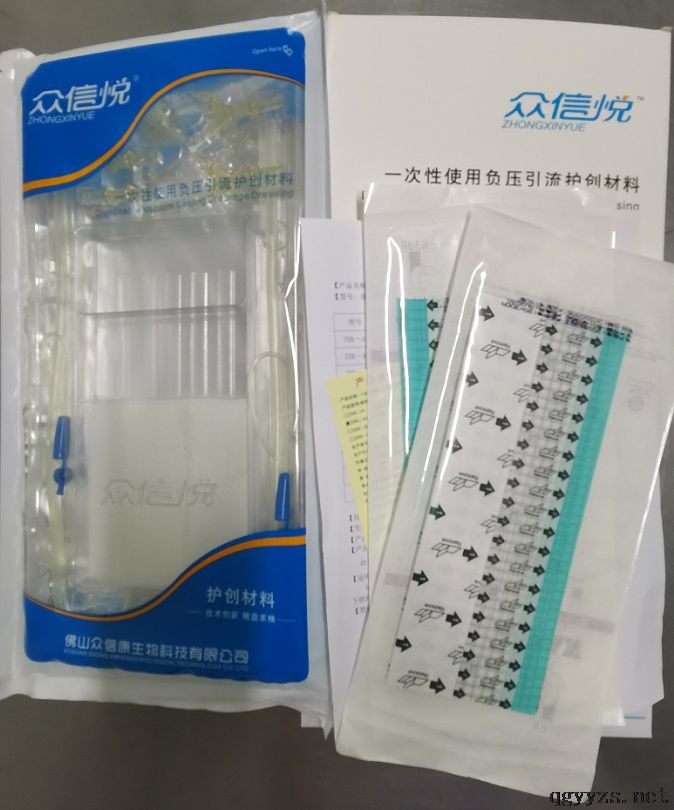 | 补充说明 | 我公司生产的VSD负压引流护创材料用医用泡沫海绵包裹引流管,使泡沫材料成为引流管和被引流腔隙或创面间的中介,引流管外接冲洗管路,再利用具有生物阀功能的半透性粘贴薄膜封闭被引流区,使之与外界隔绝,接通高负电源,形成一个高效引流系统。我们的VSD负压引流护创材料能及时清理被引流区的渗出物,且可以5-8天换一次药,具有创面愈合快、感染率低、更换敷料次数少、抗菌药物使用少、降低医药费用等特点,能使急性创伤的愈合时间加快60%以上,慢性创面的愈合速度时间加快2—3倍,总体降低了患者的医疗费用。 |
