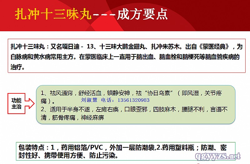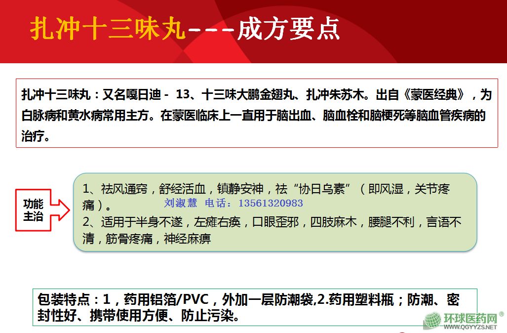 | 补充说明 | 扎冲十三味丸能有效的抑制血栓形成、溶解血栓。促进脑出血血肿吸收和受损受损的脑细胞恢复功能,使半身不遂、言语不利、口眼斜歪迅速康复。 扎冲十三味丸能软化血管、降低血管阻力和血液粘稠凝聚状态,增加心脑供血,改善心脑慢性供血不足引起的眩晕、胸闷、头痛等症。 扎冲十三味丸可改善椎基底动脉缺血,使局部受压的神经根细胞和粘连变性的肌肉组织松懈和修复。可有效缓解颈椎病引起的**症状。 扎冲十三味丸改善机体微循环,抑制WBC、肥大细胞和免疫复合物沉积于关节滑囊和血管壁上,因而对风湿、类风湿疗效**。 |