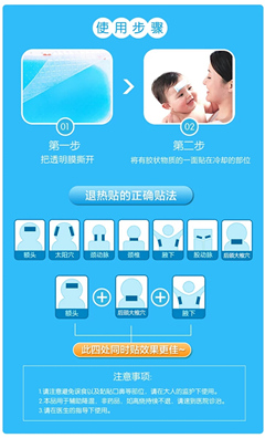 | 使用方法 | 温速度1、沿缺口撕开包装袋,取出贴剂,揭开透明胶膜,将凝胶面直接敷贴于额头或太阳穴,也可敷贴于颈部大椎穴;2、为加快降可加用数贴,同时贴在人体左右颈总动脉、左右股动脉处;3、每天1~3次,每贴可连续使用4-8小时. |
