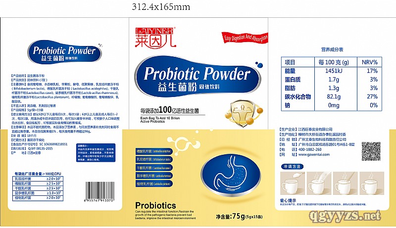 | 主要成分 | 食用葡萄糖,水苏糖乳粉,苹果粉,酵母,低聚果糖,乳双歧杆菌冻干粉,嗜酸乳杆菌冻干粉,干酪乳杆菌冻干粉,鼠李糖乳杆菌冻干粉,植物乳杆菌冻干粉,柠檬酸,葡萄糖酸钙,葡萄糖酸锌,乳酸亚铁 |