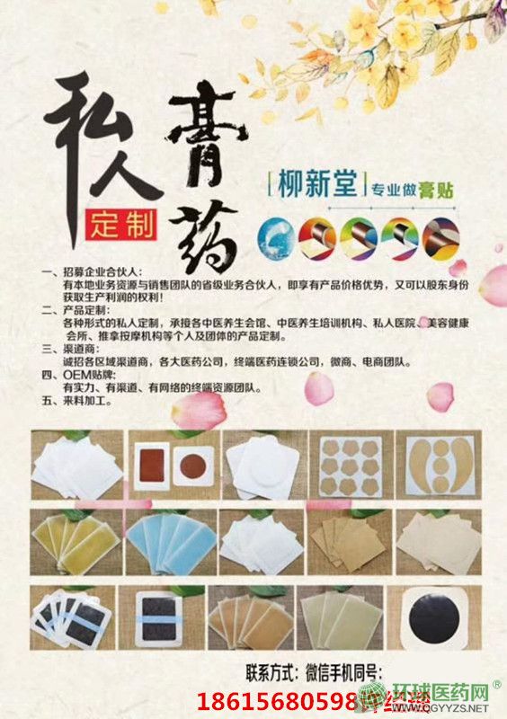| 补充说明 | 感冒贴(风寒)、感冒贴(风热)、腹泻贴(热邪)、腹泻贴(寒邪)、足贴、退热贴、消食贴、止咳贴等总共23个品种;我们听取了很多终端诊所的建议,做成了中药的药面大贴,去掉了圈,药芯非常大(一种是直径5cm药芯、一种药芯是6cm*8cm),直接贴敷穴位,方便快捷,药效非常好。 |