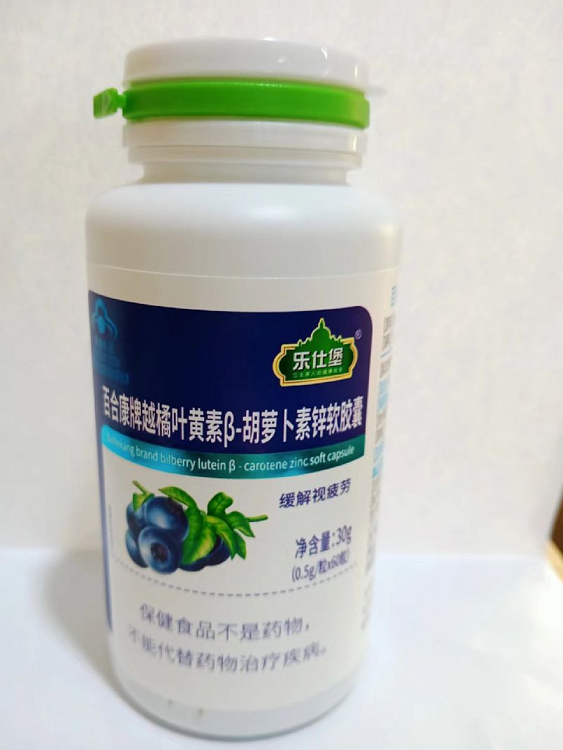| 补充说明 | 【原料】越橘提取物(经辐照)、葡萄糖酸锌、叶黄素、β-胡萝卜素 【辅料】大豆油、明胶、纯化水、甘油、蜂蜡、胭脂红 【标志性成分及含量】每100g含:原花青素0.9g、β-胡萝卜素76mg、叶黄素0.16g 【适宜人群】视力易疲劳者 【不适宜人群】少年儿童、孕妇、乳母 【保健功能】缓解视疲劳 【食用量及食用方法】每日2次,每次2粒,口服 【规格】0.5g/粒 【贮藏方法】避光、阴凉干燥处保存 【保质期】24个月 【注意事项】本品不能代替药物;适宜人群外的人群不推荐食用本产品;本品添加了营养素,与同类营养素同时食用不宜超过推荐量 |