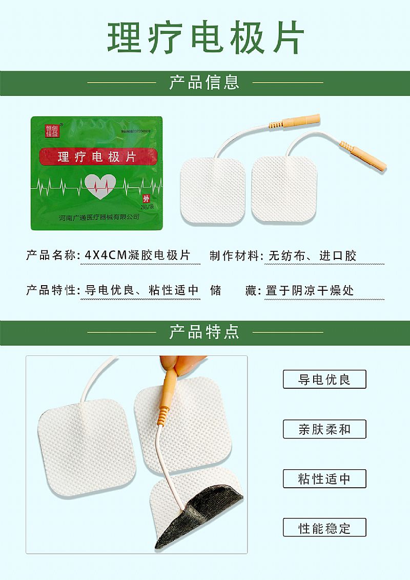 | 产品用途 | 使用时,贴附在理疗部位。配合中低频、干扰电等电疗设备,将电疗设备输出的电刺激信号传导到人体皮肤表面。 |