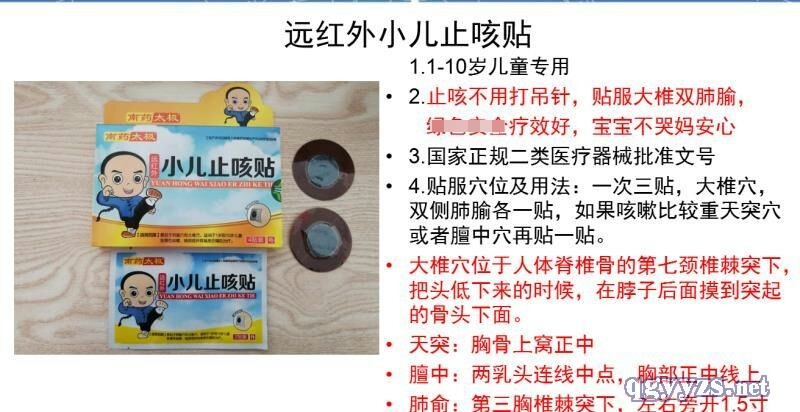| 产品用途 | 数贴于肺腧穴和大椎心,”适用于1岁到10岁儿童急慢性嗽、咳痰或伴有喘息的辅助治疗。 |