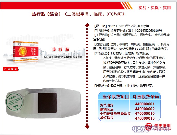 | 补充说明 | 【规 格】9cm*11cm*1贴*2袋*200盒/件 【注册证号】鲁食药监械(准)字2014第2260610号 【主要结构】该产品由敷膜无纺布、压敏胶贴、发热袋及硅油纸制成 【适应范围】适用于颈椎病、肩周炎、腰椎盘突出。肌肉劳损、风湿性关节炎、软组织损伤(非急性期)的辅助治疗。 |
