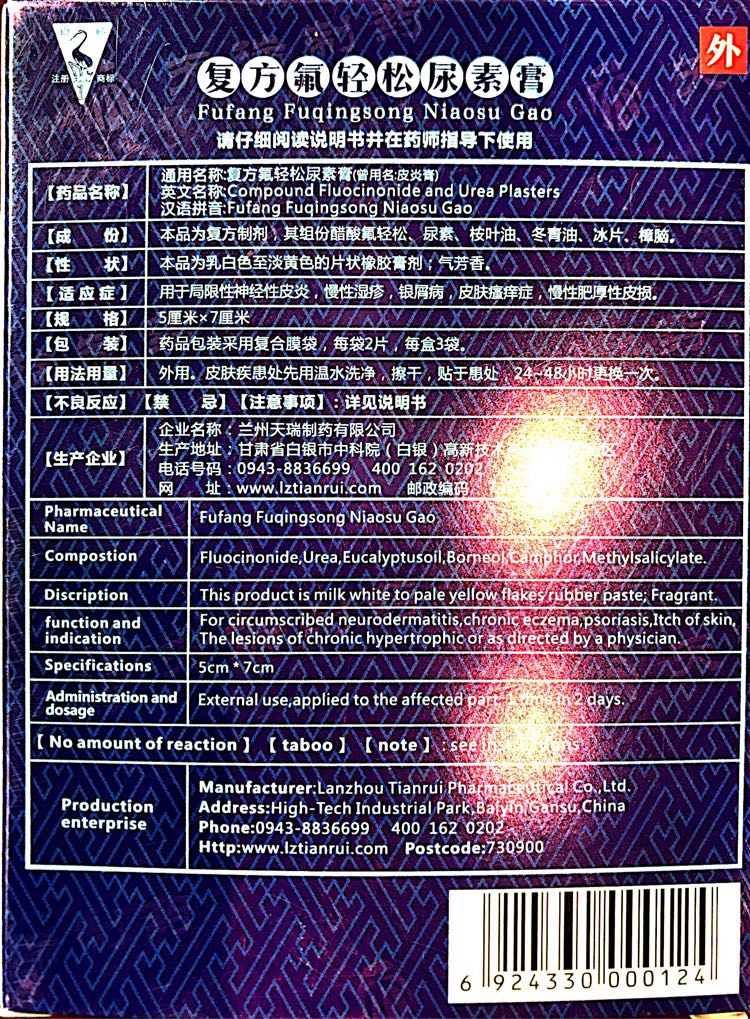 | 补充说明 | 本品为复方制剂,其组分为醋酸氟轻松,尿素,按叶油等 |