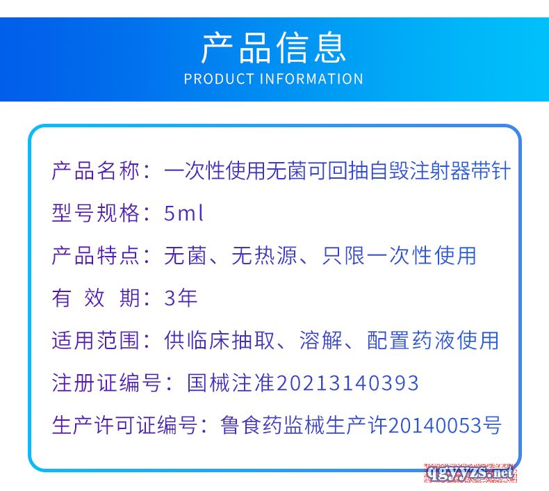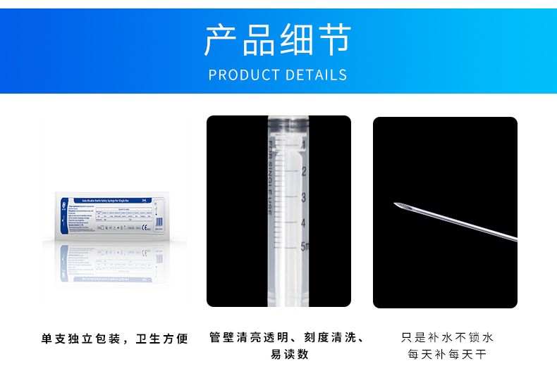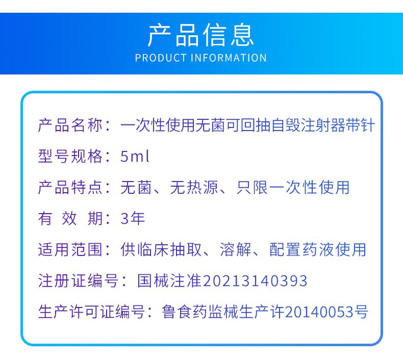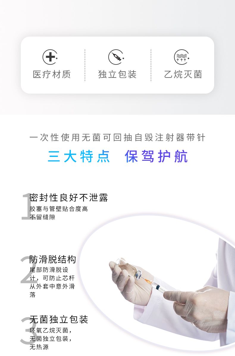| 产品卖点 | 优势:外套、芯杆透明、光洁能清晰观察到药夜,外套和活塞具有良好的滑动性能,操作轻松,方便。针管可完全回缩到注射器外套内,降低医护人员被针刺伤及感染风险。 |