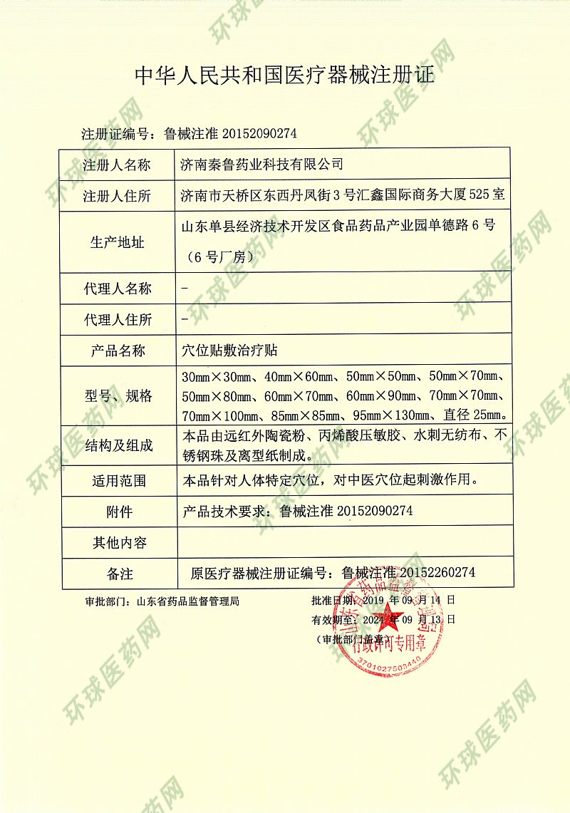 | 产品用途 | 详见包装说明以及内置说明书【产品名称】穴位贴敷治疗贴 【结构及组成】本品由远红外陶瓷粉、丙烯酸压敏胶、水刺无纺布、不锈钢珠及离型 纸制成。穴位贴敷治疗贴的压敏胶布剥离强度不小于1.0N/cm,持粘性应 不大于2.5mm,远红外发射波长范围8μm—15μm,法向比辐射率≥75%。 【适用范围】本品针对人体特定穴位,对中医穴位起刺激作用。 【使用方法】1、清洁相应穴位,先以拇指依次揉按相应穴位,每次1~2分钟,范围由小 到大。力量由轻到重,探寻敏感点。 2、确认包装无破损后,打开包装,取出穴位贴敷治疗贴,将贴剂的隔离 膜撕去,以钢珠对准相应穴位敏感点贴压,1片/穴、天,每日适度按 压3~5次,每次3~5分钟,1个疗程为10天,疗程间隔2~3天。 |