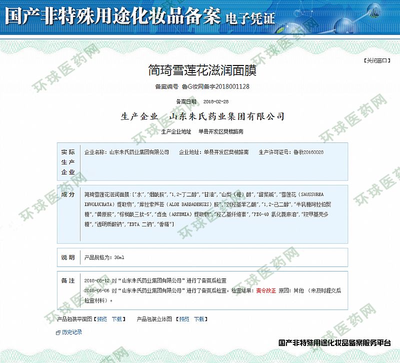 | 品牌名称 | 简琦雪莲花滋润面膜 |
