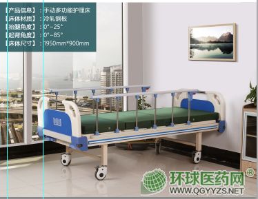 | 主要成分 | 床面采用冷轧钢板一次冲压成型,激光切割,焊接成型,表面静电喷涂,ABS不锈钢复合床头,六档路铝合金加高护栏,可折叠,ABS隐形摇把,医用静音万向脚轮,可选配床垫餐桌板,输液架等。 |