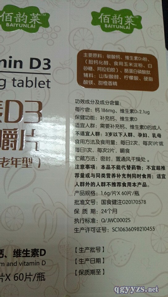 | 主要成分 | 碳酸钙、维生素D3粉、胆钙化醇、食用玉米粉、白砂糖、阿拉伯胶、酪蛋白磷酸肽、山梨醇、柠檬酸、硬脂酸镁、甜橙香精 |