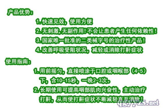 | 其它说明 | 【使用方法】:口腔内使用:取下颈部透明盖,喷头朝上旋转,直接喷于咽喉部与上颚、每次喷3-5下,保持口腔湿润,呼吸顺畅,每晚1-3次或多次 【注意事项】: (1)本产品多次使用,开封后半个月内使用完,放置过久,自动失效; (2)每次使用后注意盖紧保护盖、置于阴凉、干燥、清洁处; (3)本品外用,至于儿童不宜接触处。 |