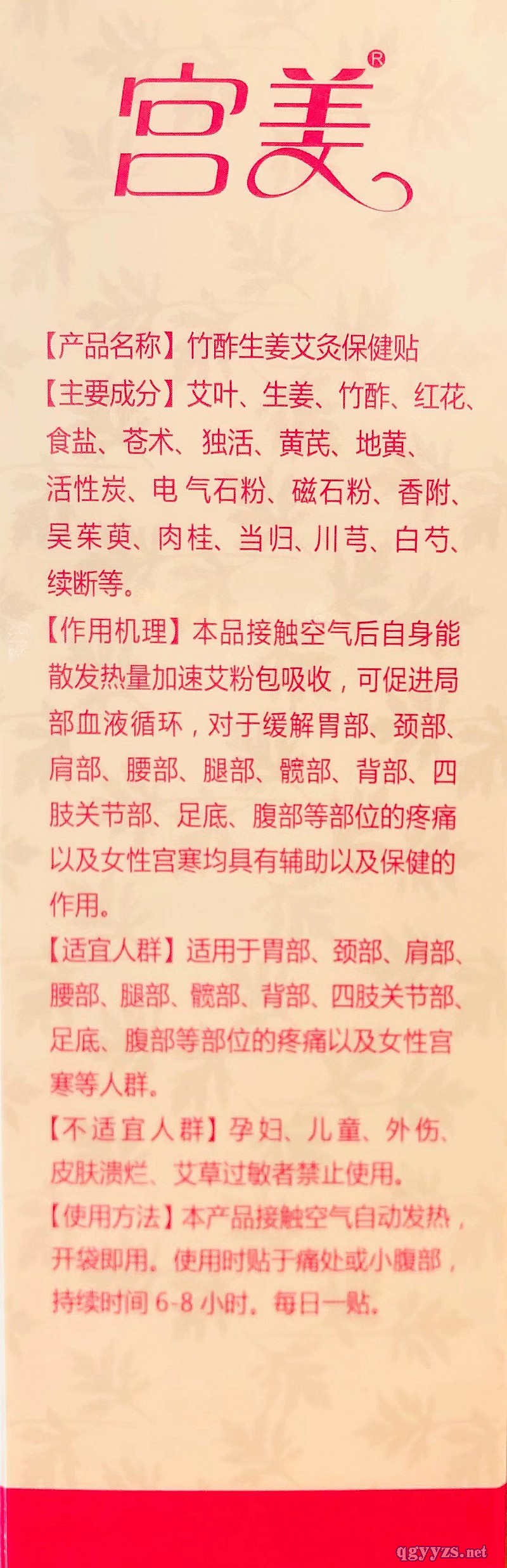 | 主要成分 | 艾叶、生姜、竹酢、红花、食盐、苍术、独活、黄芪、地黄、活性炭、电气石粉、磁 石粉、香附、吴茱萸、肉桂、当归、川芎、白芍、续断等。 |