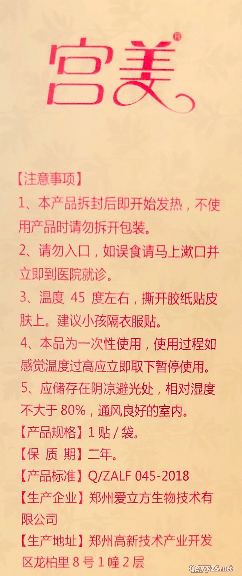 | 补充说明 | [产品名称]:竹酢生姜艾灸暖宫贴 [主要成分]:艾叶、生姜、竹酢、红花、食盐、苍术、独活、黄芪、地黄、活性炭、电气石粉、磁 石粉、香附、吴茱萸、肉桂、当归、川芎、白芍、续断等。 [作用机理]:本品接触空气后自身能散发热量加速艾粉包吸收,可促进局部血液循环,对于缓解胃部 、颈部、肩部、腰部、腿部、髋部、背部、四肢关节部、足底、腹部等部位的疼痛以及女性宫寒均 具有辅助以及保养的作用。 [适宜人群]:适用于胃部、颈部、肩部、腰部、腿部、髋部、背部、四肢关节部、足底、腹部等部位 的疼痛以及女性宫寒等人群。 [不适宜人群]:孕妇、儿童、外伤、皮肤溃烂、艾草过敏者禁止使用。 [使 用方 法]:本产品接触空气自动发热,开袋即用。使用时贴于痛处或小腹部,持续时间6-8小时。 每日一贴。 [注意事项] 1、本产品拆封后即开始发热,不使用产品时请勿拆开包装。 2、请勿入口,如误食请马上漱口并立即到医院就诊。 3、温度45度左右,撕开胶纸贴皮肤上。建议小孩隔衣服贴。 4、本品为一-次性使用,使用过程如感觉温度过高应立即取下暂停使用。5、应储存在阴凉避光处,相 对湿度不大于80* ,通风良好的室内。 [产品规格] 1贴/袋。 保质期 二年 [不适宜人群]:孕妇、儿童、外伤、皮肤溃烂、艾草过敏者禁止使用。 [使 用方 法]:本产品接触空气自动发热,开袋即用。使用时贴于痛处或小腹部,持续时间6-8小时。 每日一贴。 [产品标准] Q/ZALF 045-2018 [生产企业)郑州爱立方生物技术有限公司 [生产地址)郑州高新技术产业开发区龙柏里8号1幢2层 [咨询热线] 0371-60961096 [联系电话] 曹经理 18603812220 秦经理18039519867 喻经理19913875788 乔经理 18937132342 曹经理 18037311680 陈经理15538711170 |